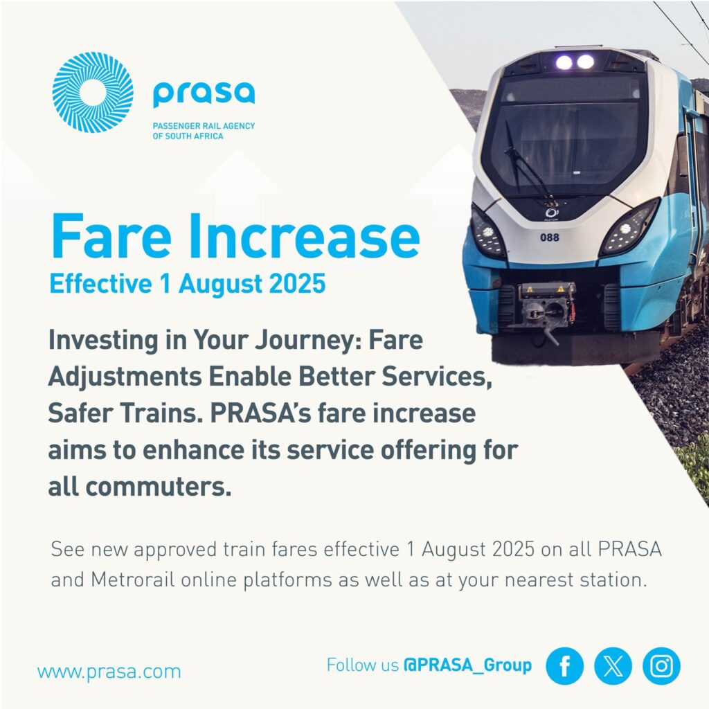 The General Industries Workers Union of South Africa (GIWUSA) is calling for the immediate reversal of Metrorail’s planned fare increases, which are scheduled to take effect on 1 August 2025.